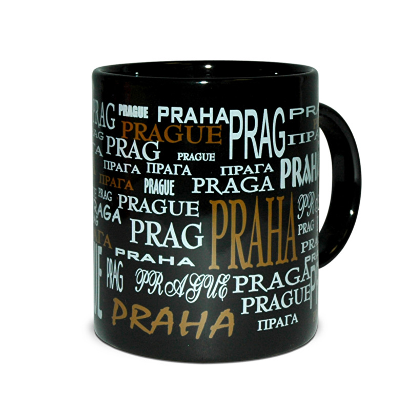 Černý keramický hrnek s texty Praha v různých světových jazycích.