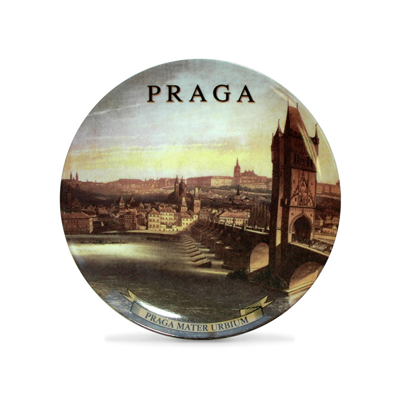 Porcelánový dekorovaný talíř s otvorem na zavěšení s motivem Karlova mostu.