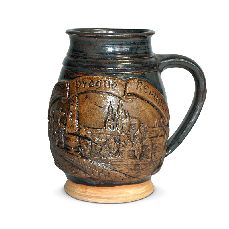 Tmavý keramický korbel glazurovaný ručně točený, reliéf s motivem Prahy.