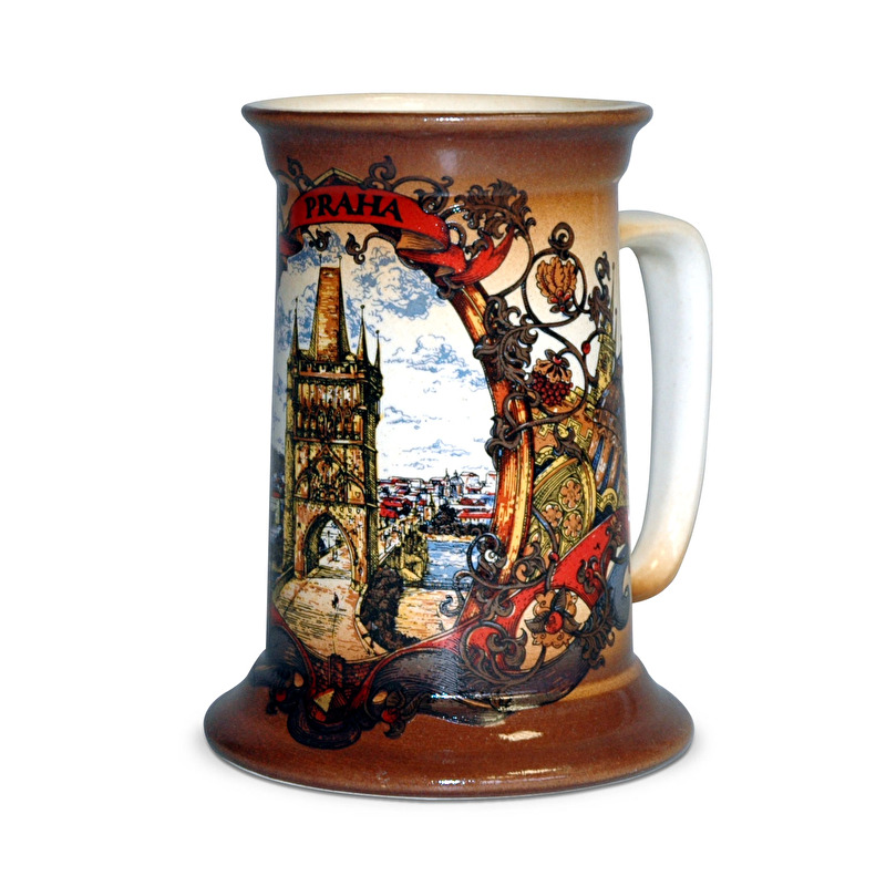 Střední keramický glazurovaný korbel s mixem motivů Prahy.