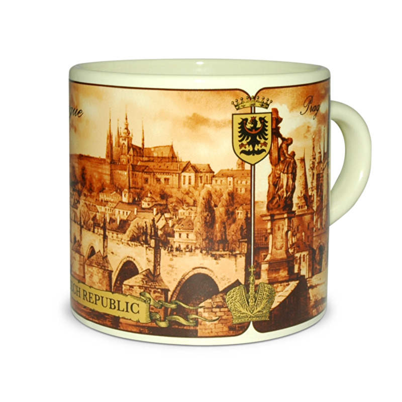 Velký keramický hrnek na čaj v béžové barvě s obrázkem Pražského hradu a Karlova mostu.