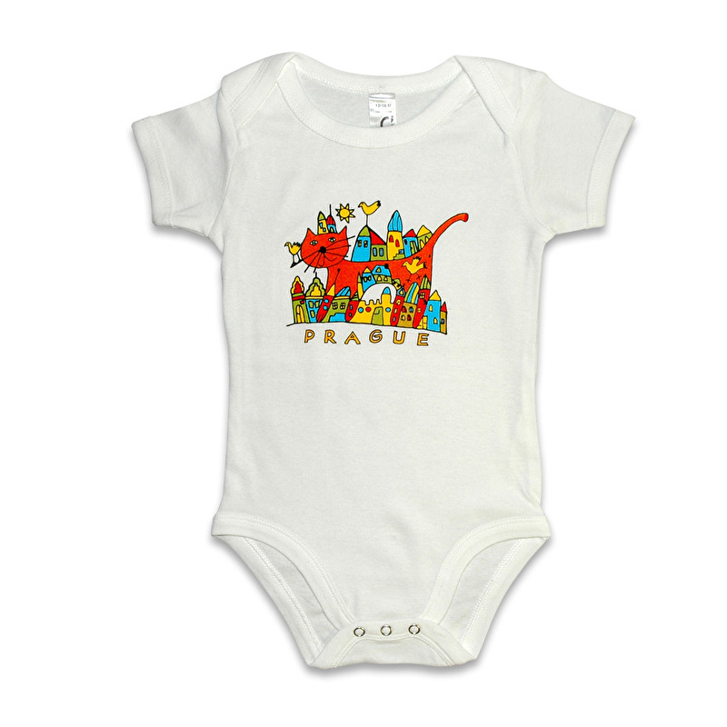 Bílé bavlněné dětské body s motivem kočky a nápisem Prague. Dětské body je v nabídce ve třech velikostech.