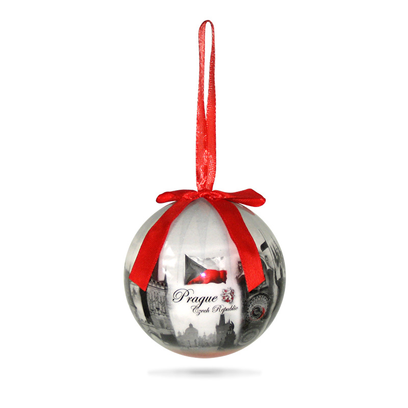 Die Christbaumkugel mit dem Motiv von Prag und mit Aufschrift Prague und mit Schachtel.