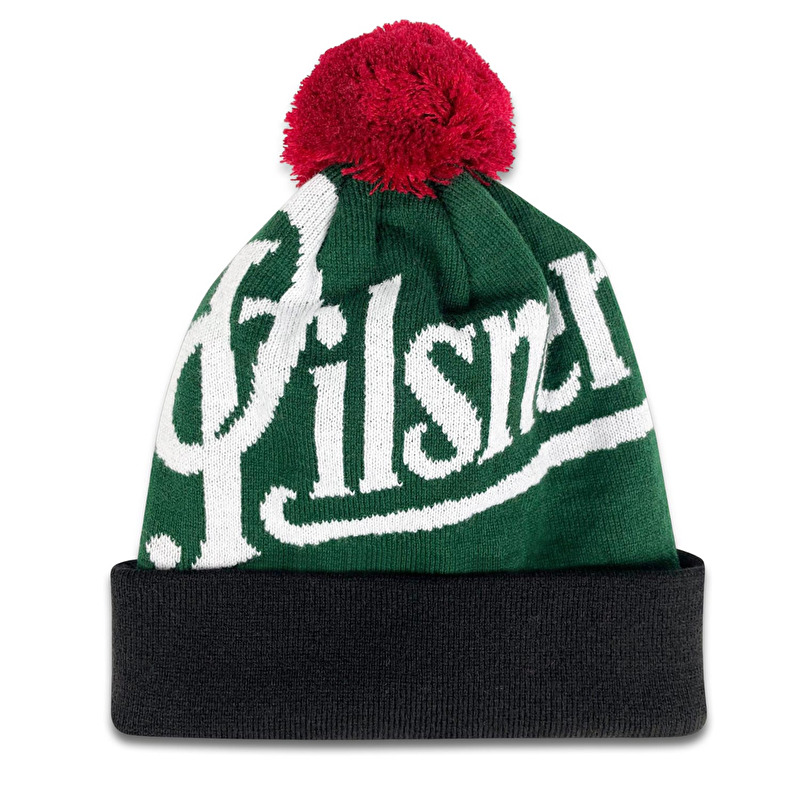 Mütze Fellbommel mit Pilsner Urquell Aufschrift.