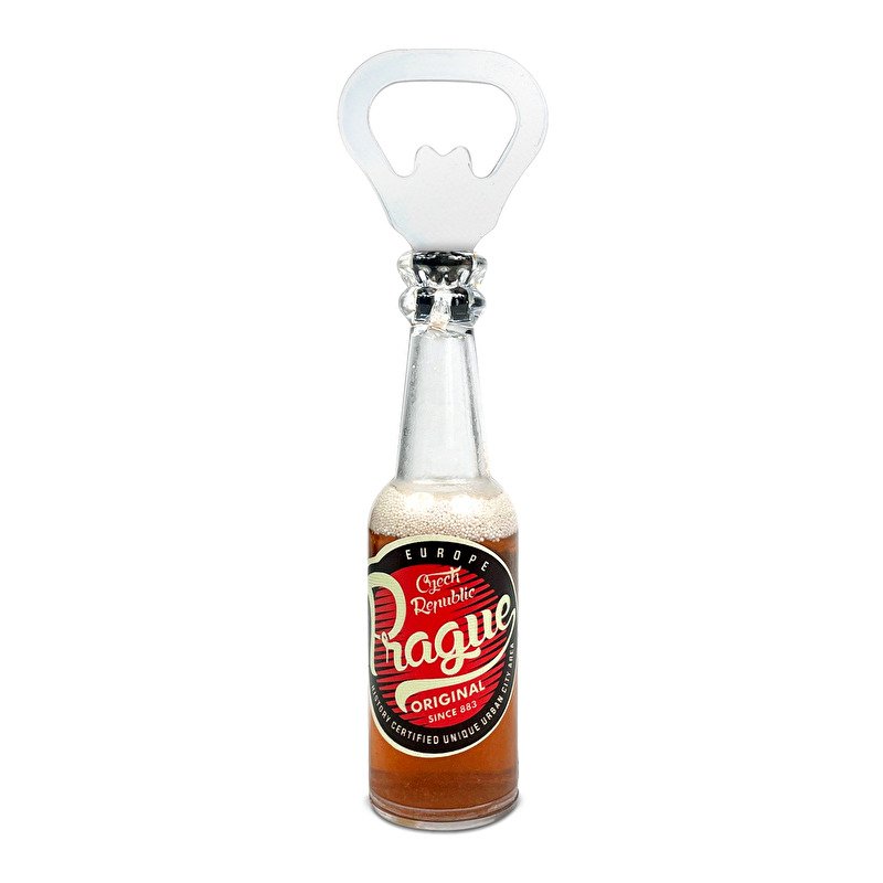 Kunststoff-Magnet-Öffner in Form einer Flasche mit flüssigem Inhaltn und mit Pin-Up-motiv.