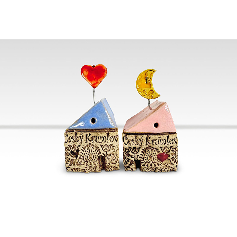 Original handcrafted ceramic houses that capture the charm of the picturesque town of Český Krumlov. Each house is decorated with delicate ornaments and the inscription "Český Krumlov." Above the rooftops, wires with colorful decorations, such as a red heart or a yellow moon, rise elegantly.