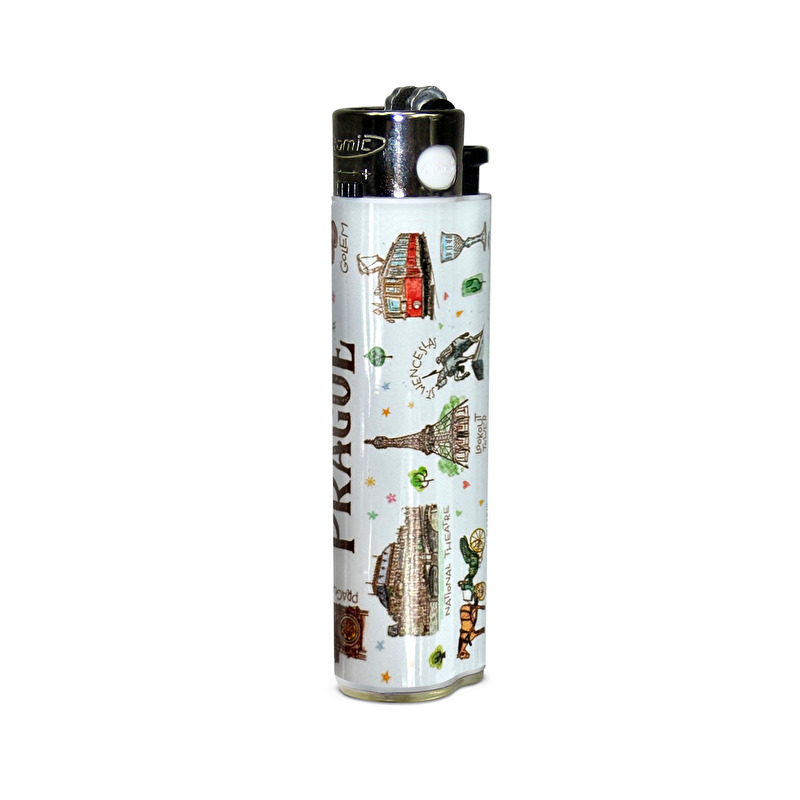 A stylish lighter featuring a Prague-themed design with illustrations of the city's most famous landmarks, including Charles Bridge, Prague Castle, the National Theatre, and Petřín Tower.