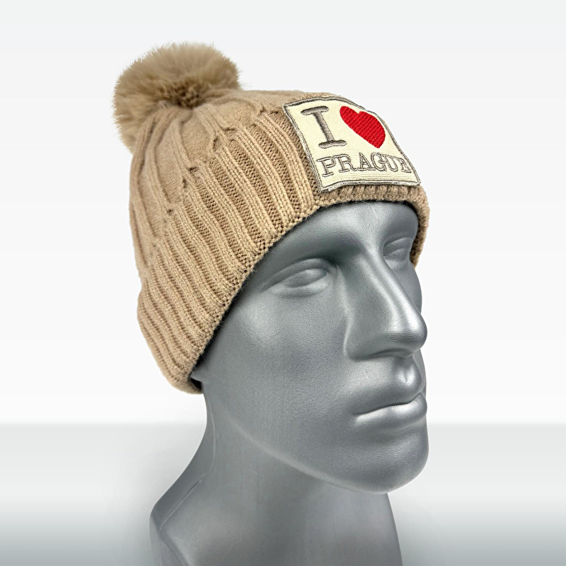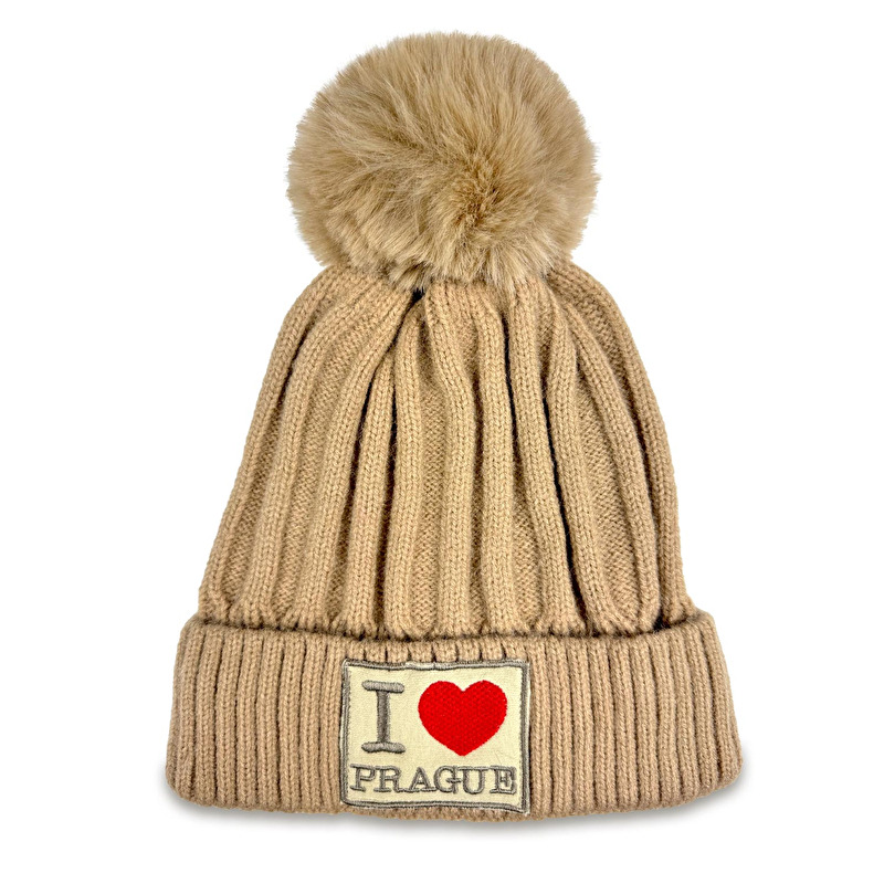 A trendy and versatile beige beanie with a fluffy pom-pom, perfect for the winter season. Made from soft and warm material, it ensures maximum comfort and protection against the cold. Its neutral shade makes it easy to pair with various outfits. The "I ❤️ Prague" embroidered patch adds a unique touch, making it an excellent gift or souvenir for anyone who loves this beautiful city.