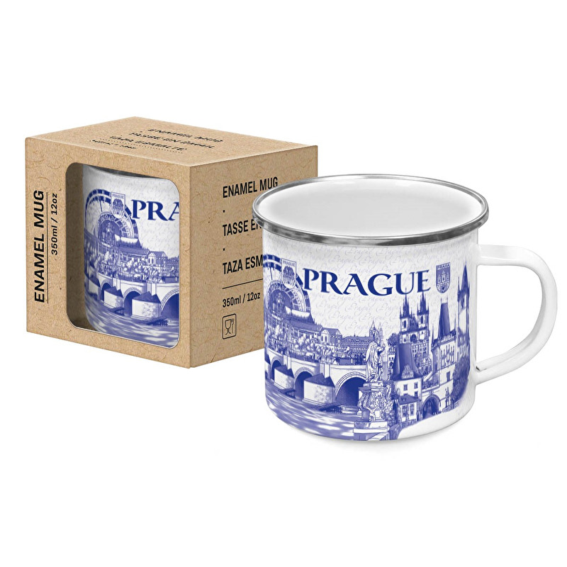 The mug features a detailed illustration of iconic landmarks, including Charles Bridge and historic towers, complemented by delicate handwritten “Prague” text.