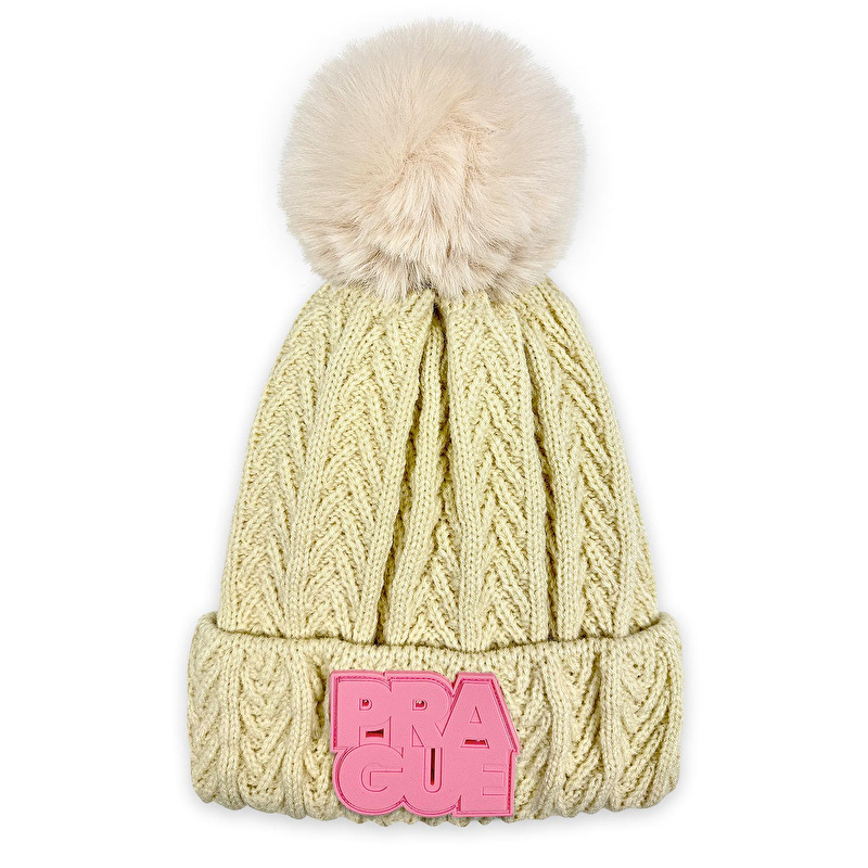 The bold pink rubber patch with a 3D "PRAGUE" inscription adds a modern flair. Featuring a rich knit pattern and a large light-colored pom-pom, it is the perfect accessory for any winter season.