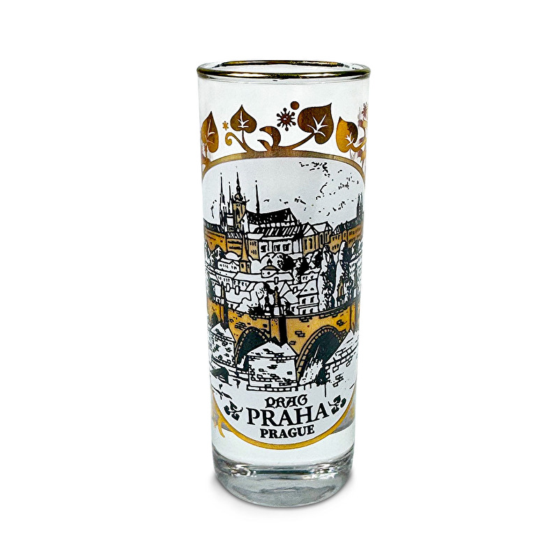 The glass shows an iconic view of Charles Bridge and the historic Prague skyline.