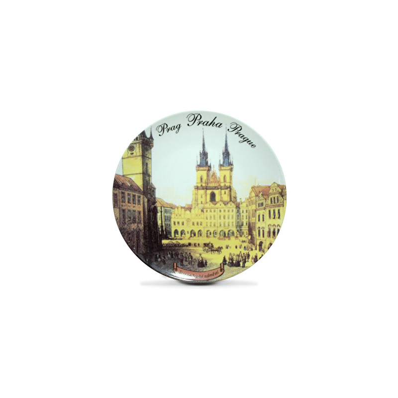 Porcelain decorated plate with a hole to hang on with the motif of Old Town Square.