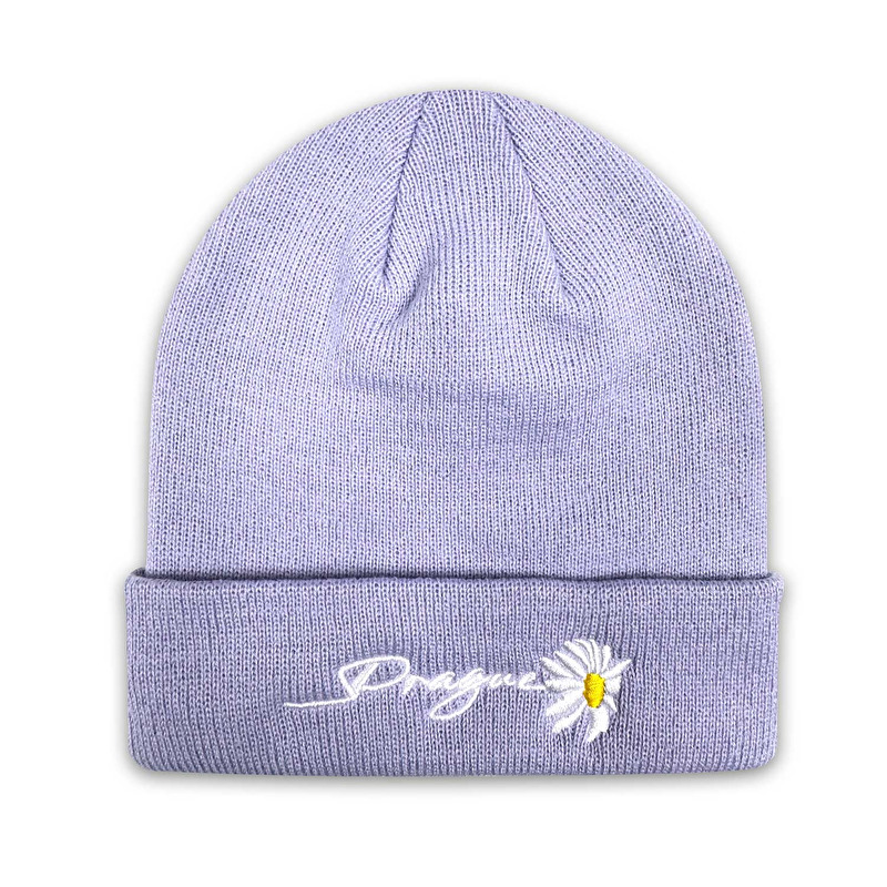 Mũ len màu tím nhạt (lavender) với phần gập viền và thêu chữ “Prague” kèm hoa cúc trắng.